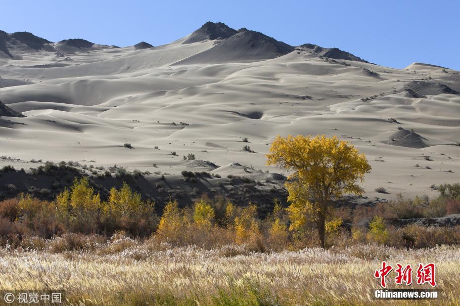 10月6日,甘肅酒泉,位于庫木塔格沙漠東緣的大峽谷被金黃的胡楊裝點(diǎn)出絢爛的秋色。 圖片來源:視覺中國