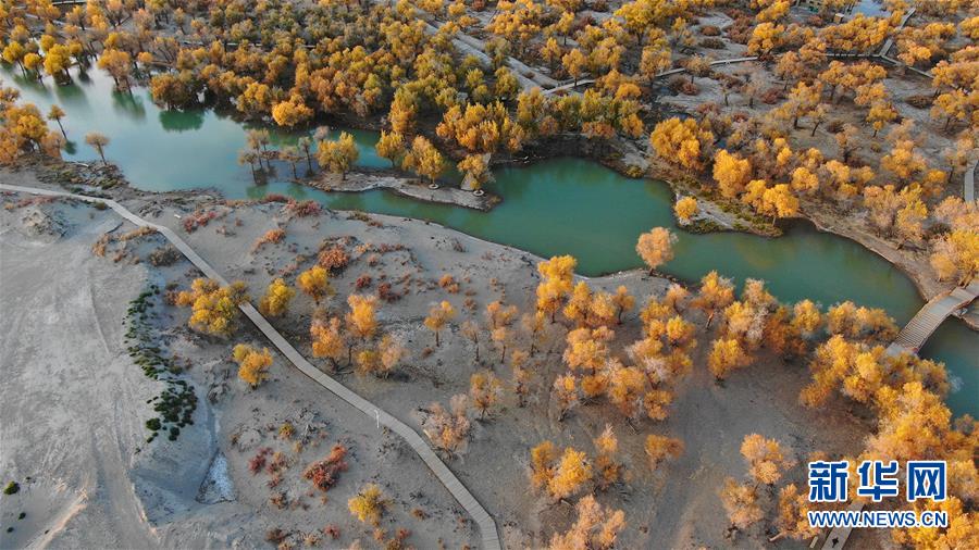 這是在內(nèi)蒙古自治區(qū)額濟(jì)納旗拍攝的胡楊林(10月10日無人機(jī)拍攝)。 金秋時節(jié),內(nèi)蒙古自治區(qū)額濟(jì)納旗胡楊林如同披上金裝,成為大漠中的一抹亮色,吸引眾多中外游客前來觀賞游玩。 新華社記者鄒予攝