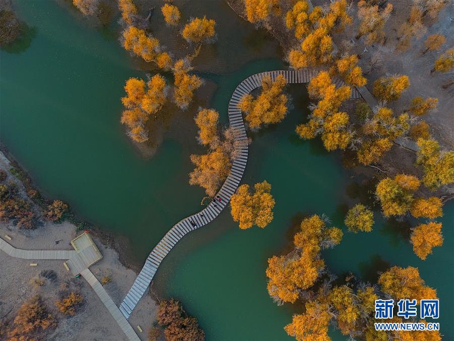 這是在內(nèi)蒙古自治區(qū)額濟(jì)納旗拍攝的胡楊林(10月10日無人機(jī)拍攝)。 金秋時(shí)節(jié),內(nèi)蒙古自治區(qū)額濟(jì)納旗胡楊林如同披上金裝,成為大漠中的一抹亮色,吸引眾多中外游客前來觀賞游玩。 新華社記者劉磊攝