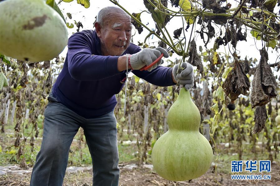 9月27日,山西省安澤縣和川鎮(zhèn)孔旺村的村民在摘葫蘆。近日,山西省安澤縣和川鎮(zhèn)孔旺村種植的葫蘆喜獲豐收,村民們忙著將摘下的葫蘆去皮晾干??淄逵?016年成立葫蘆種植合作社,種植、采摘、加工等環(huán)節(jié)全部由貧困戶負(fù)責(zé),為貧困戶拓寬增收渠道。新華社記者 曹陽 攝