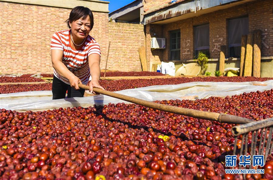 9月22日,河北省棗強(qiáng)縣棗強(qiáng)鎮(zhèn)孟家莊村的棗農(nóng)在晾曬紅棗。 近日,河北省棗強(qiáng)縣的2000多畝棗園迎來收獲季,棗農(nóng)們搶抓農(nóng)時(shí),采摘、篩選、晾曬紅棗,樂享秋收的快樂。 新華社記者李曉果攝