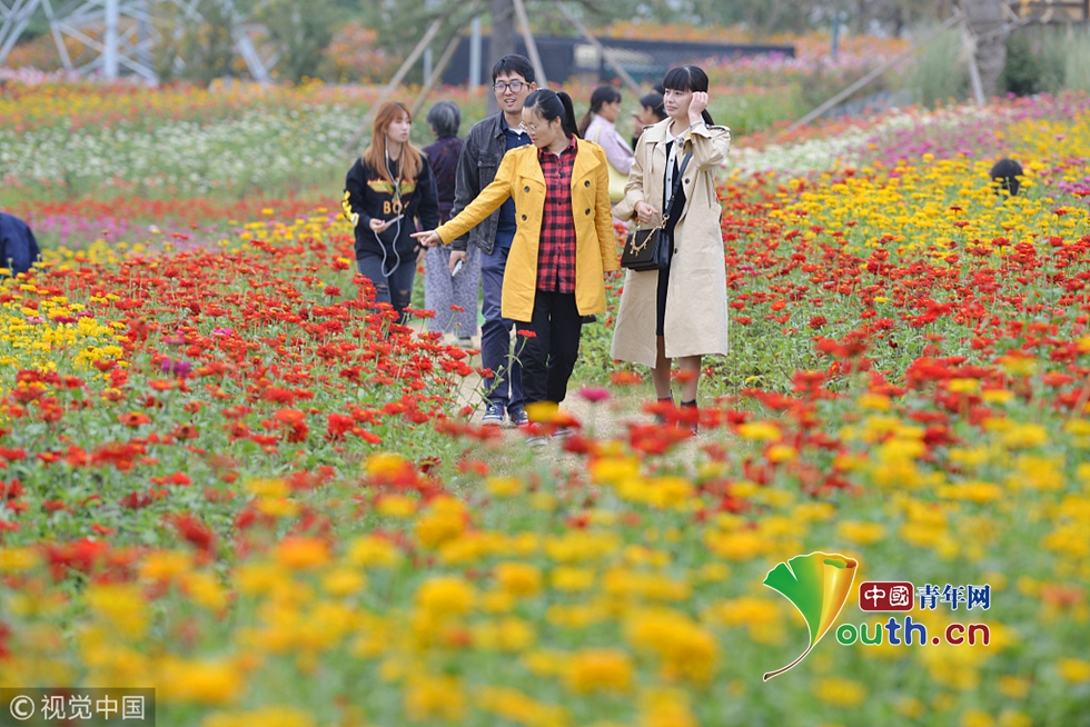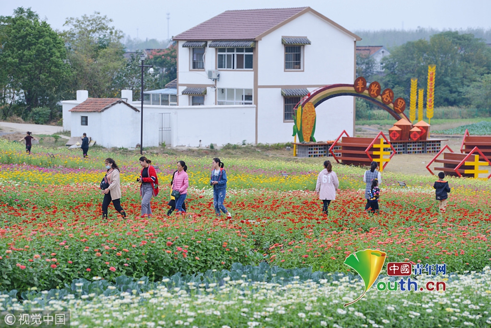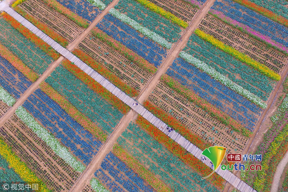 2018年10月14日,江蘇南京,江寧區(qū)谷里街道徐家院村的50萬(wàn)株百日菊競(jìng)相綻放,大紅、黃色、紫色……遠(yuǎn)遠(yuǎn)望去仿佛是田野間鋪上一層“五彩地毯”, 成了金秋里一道花宴盛景,吸引不少游人徜徉其中。圖片作者:方東旭/視覺中國(guó)