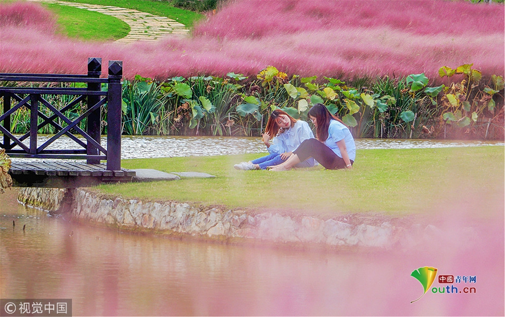 中國(guó)青年網(wǎng)北京10月7日電 2018年10月6日,游客在“粉色田野”里游玩、留影。粉黛亂子草是一種觀賞草種,該植物夏季為主要生長(zhǎng)季,全株綠色,花期為9月中旬至11月中旬,開(kāi)花時(shí),綠葉為底,粉紫色花穗如發(fā)絲從基部長(zhǎng)出,遠(yuǎn)看如紅色云霧。