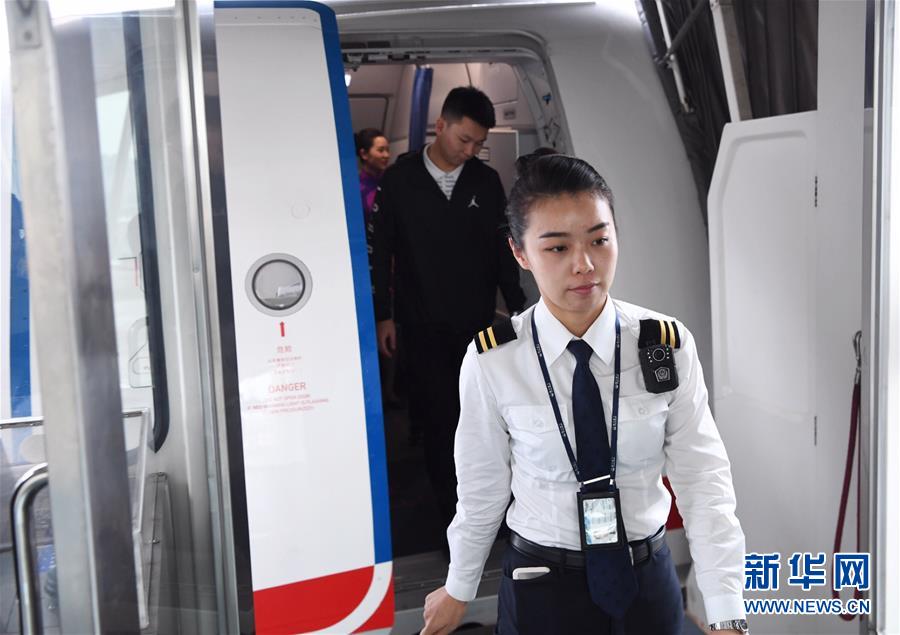10月16日,航班抵達重慶江北國際機場后,湯春燕第一個走出艙門,準(zhǔn)備迎接旅客下機。 新華社記者王全超攝