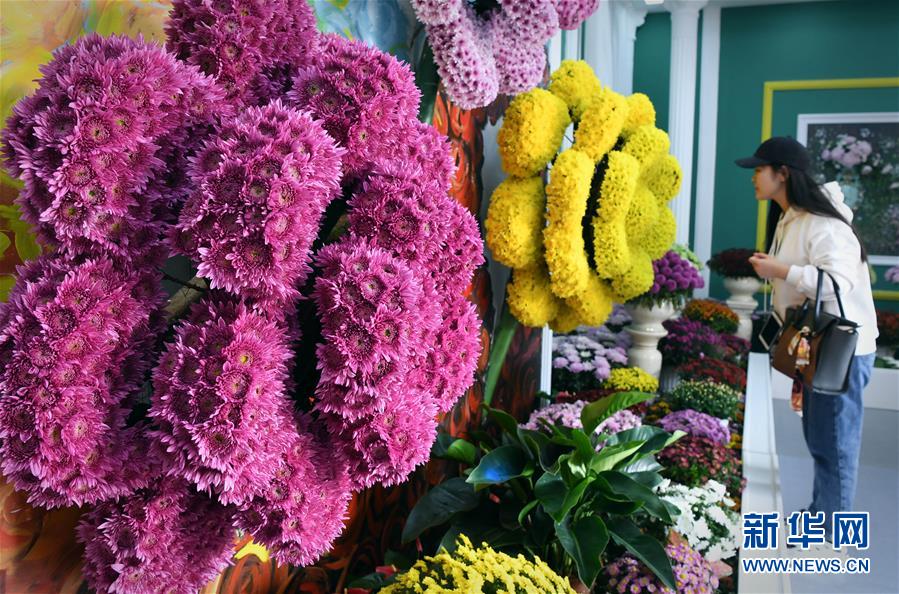 10月17日,游客在開封清明上河園觀賞菊花。重陽時(shí)節(jié),各色菊花競(jìng)相綻放,把古都開封裝點(diǎn)得分外秀美,吸引眾多游客前來觀賞游玩。 新華社記者 李安 攝
