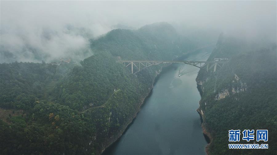 10月18日無人機(jī)航拍的江界河大橋。 當(dāng)日,位于貴州甕安縣的江界河大橋云霧環(huán)繞,景美如畫。 新華社記者歐東衢攝