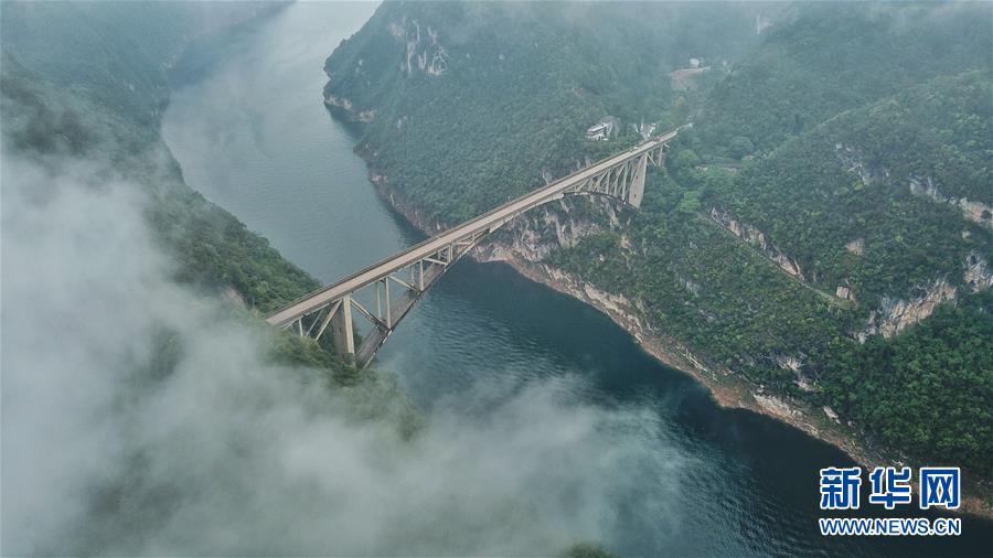 8月27日,位于貴州省甕安縣的清水河大橋云霧繚繞,景色如畫。