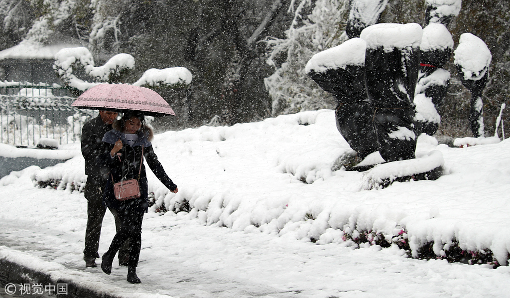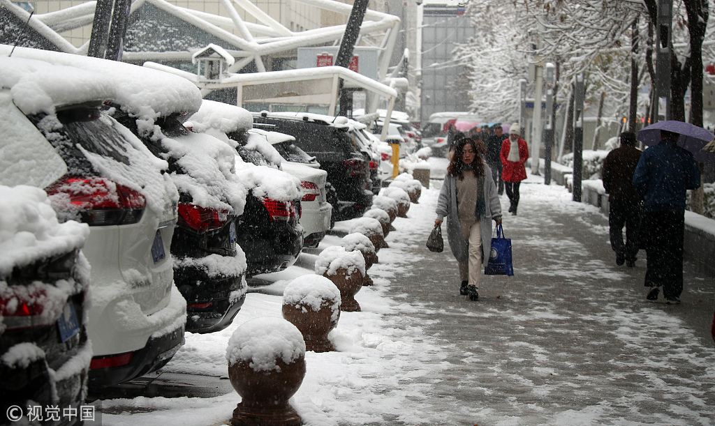 10月18日,行人穿行在烏魯木齊積雪覆蓋的人行道上。當(dāng)日,新疆烏魯木齊迎來(lái)一場(chǎng)降雪。 新華社記者 江文耀 攝