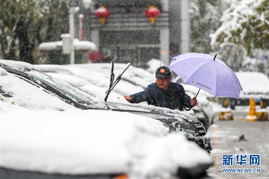 10月18日,烏魯木齊市民在清理車(chē)上的積雪。當(dāng)日,新疆烏魯木齊迎來(lái)一場(chǎng)降雪。 新華社記者 江文耀 攝