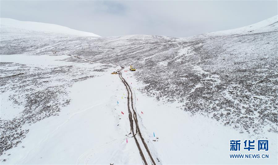 西藏道路搶通人員在西藏昌都市江達(dá)縣海拔4500米左右的高山牧場(chǎng)上搶通道路(10月14日攝)。新華社記者劉東君攝