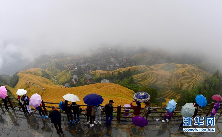10月16日,游客在秋雨中欣賞龍脊梯田秋色。金秋時節(jié),廣西龍勝各族自治縣龍脊梯田美如畫卷。 新華社記者 黃孝邦 攝