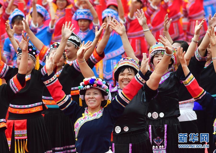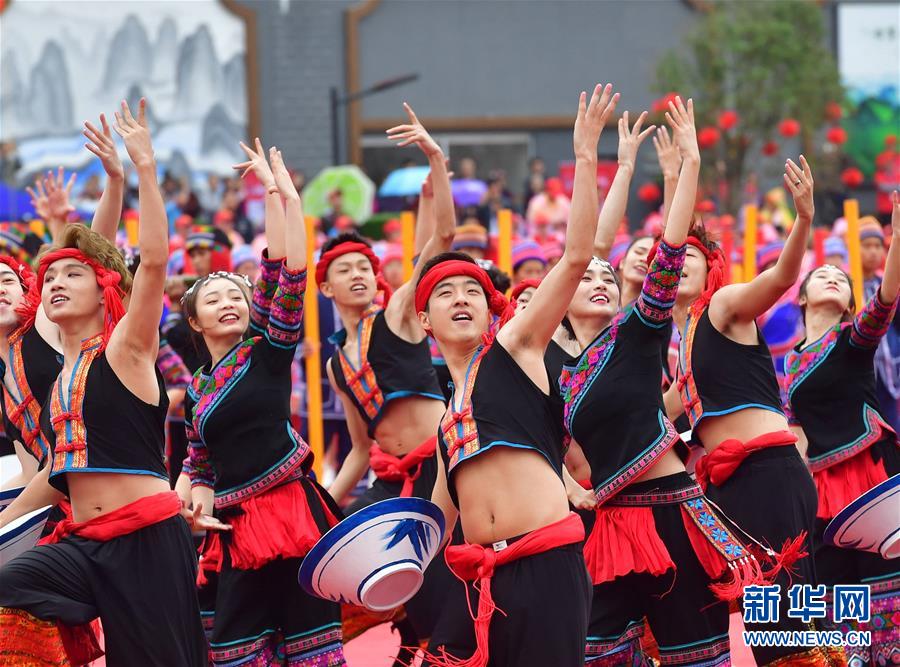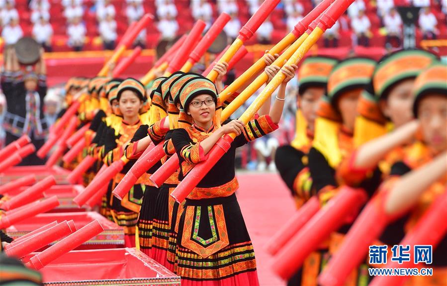 10月20日,各族同胞在廣西大化瑤族自治縣江濱文化廣場表演節(jié)目,慶??h慶?! ⌒氯A社記者陸波岸攝