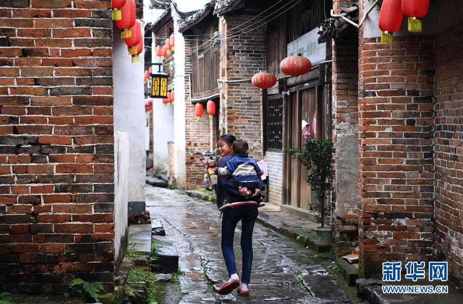 村民行走在廣西富川瑤族自治縣朝東鎮(zhèn)福溪村青石鋪就的古道上(10月19日攝)?!⌒氯A社記者 周華 攝