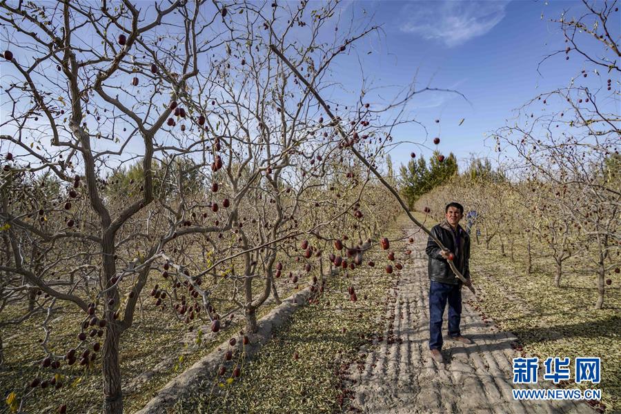 10月20日,在且末縣阿熱勒鎮(zhèn)有機紅棗園里,棗農(nóng)在打棗。 新華社記者 趙戈 攝