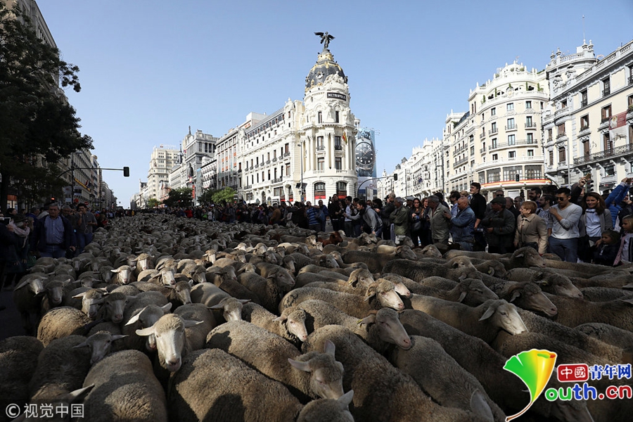 西班牙牧羊人驅趕羊群穿越馬德里 羊群進城“參觀”