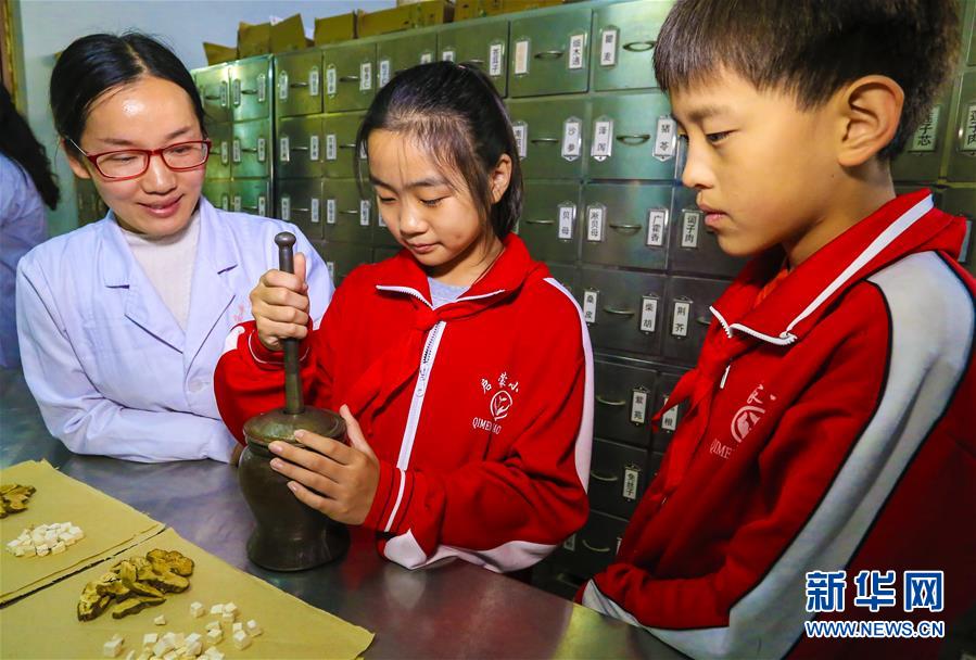 10月22日,安平縣啟蒙小學(xué)學(xué)生在安平縣中醫(yī)院醫(yī)生的指導(dǎo)下體驗(yàn)用傳統(tǒng)工具加工中草藥。 當(dāng)日是世界傳統(tǒng)醫(yī)藥日,河北省安平縣啟蒙小學(xué)組織學(xué)生走進(jìn)安平縣中醫(yī)院,通過參觀中藥房、認(rèn)識常見中藥、感受中藥加工等方式,向小學(xué)生普及中醫(yī)藥知識,弘揚(yáng)傳統(tǒng)中醫(yī)藥文化。 新華社記者李曉果攝