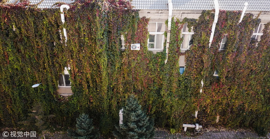 2017年10月21日,沈陽,懷遠(yuǎn)樓北側(cè)的墻面也是被爬墻虎所覆蓋,由于陽光很少能照射到植被,所以爬墻虎大都還是綠色