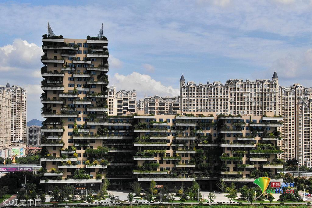 每個(gè)樓層都種植著茂盛的植物。