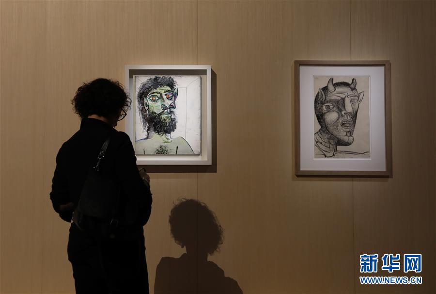 10月24日,在意大利米蘭,一名女子在“畢加索·變形記”展上觀看畢加索作品《有胡須的男人頭像》。  新華社記者程婷婷攝