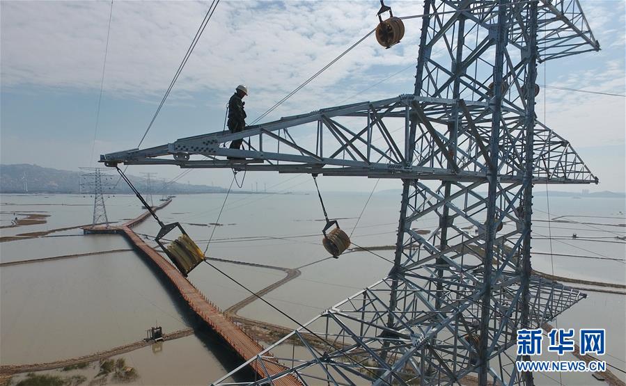 10月25日,施工人員從莆田埭頭風(fēng)電220千伏送出工程橫跨平海灣的全路徑棧橋上通過。 新華社記者林善傳攝