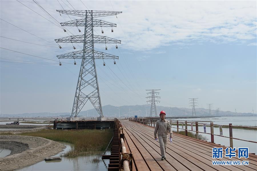 10月25日,施工人員從莆田埭頭風(fēng)電220千伏送出工程橫跨平海灣的全路徑棧橋上通過。 新華社記者林善傳攝
