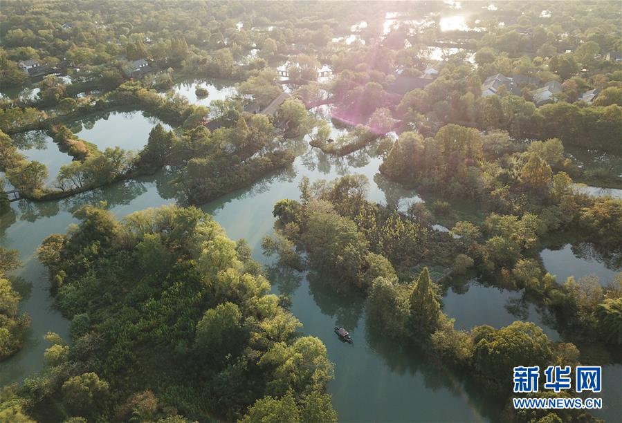 10月29日,游船行駛在西溪濕地河道上(無人機拍攝)。新華社記者翁忻旸攝