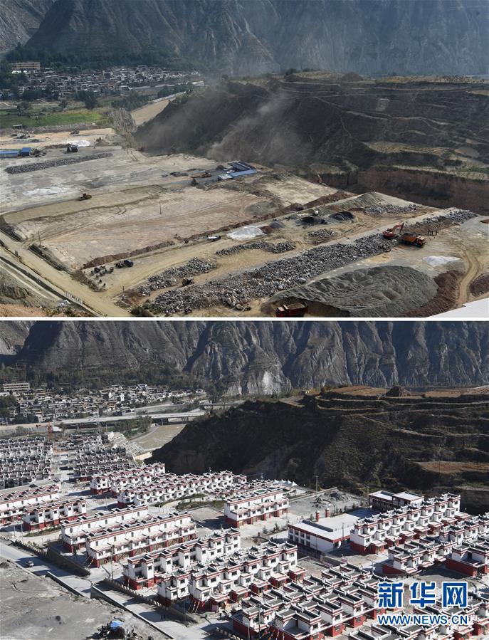 這是一張拼版照片。上圖為:隴南市武都區(qū)坪埡藏族鄉(xiāng)易地扶貧搬遷項目建設(shè)現(xiàn)場(2016年9月1日攝);下圖為:同一角度拍攝的隴南市武都區(qū)坪埡藏族鄉(xiāng)易地扶貧搬遷項目現(xiàn)場(10月31日攝)。新華社記者 范培珅攝