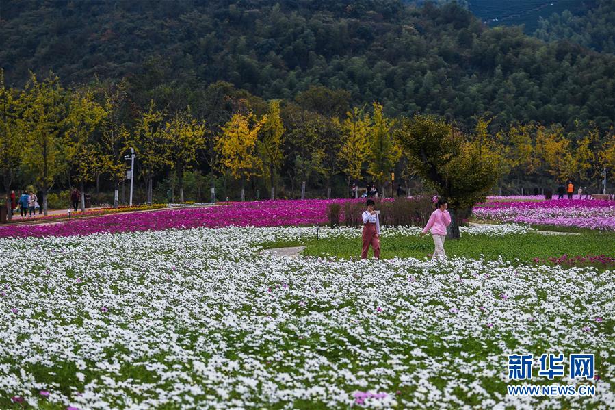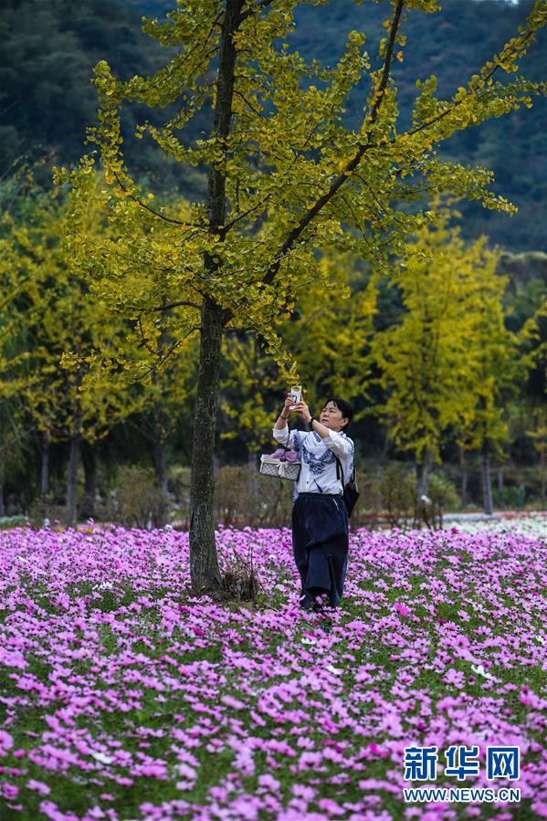 11月2日,游客在金黃的銀杏林與“五彩花?!遍g觀賞秋色。 新華社記者 徐昱 攝