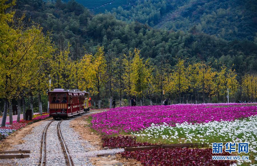 11月2日,游客乘坐觀光小火車觀賞“五彩花?!保o人機(jī)拍攝)。