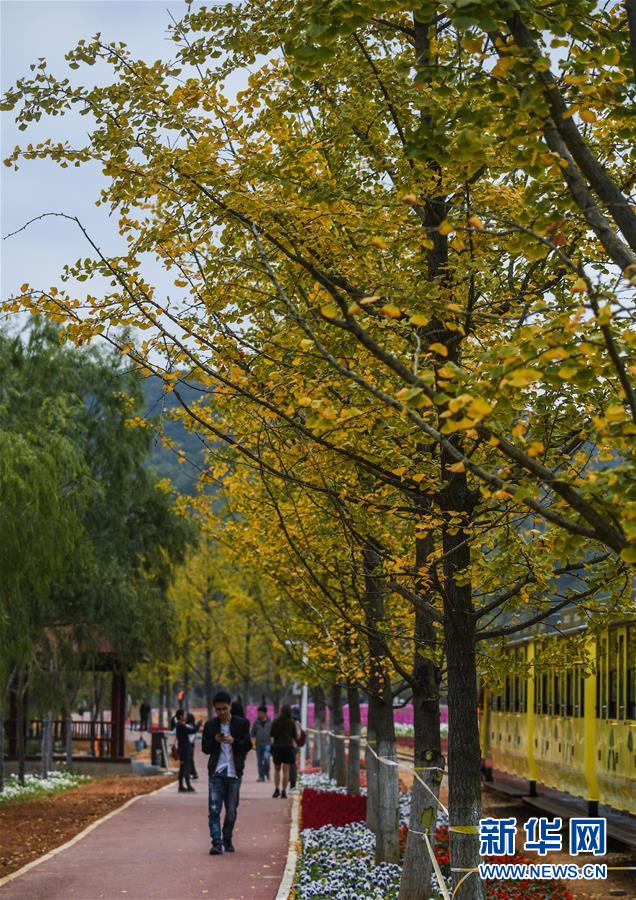 11月2日,金黃的銀杏林與“五彩花?!睒?gòu)成了美麗秋色。 新華社記者 徐昱 攝