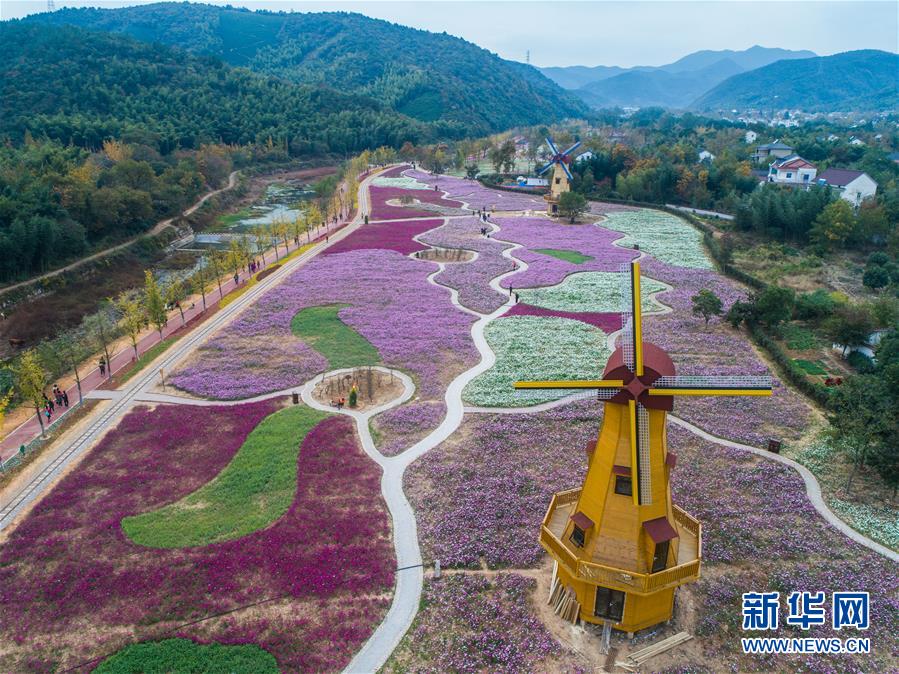11月2日,空中俯瞰小浦鎮(zhèn)的“五彩花?!?,多彩的花海與金黃的銀杏林構成了一幅美麗的秋季風景(無人機拍攝)。 新華社記者 徐昱 攝
