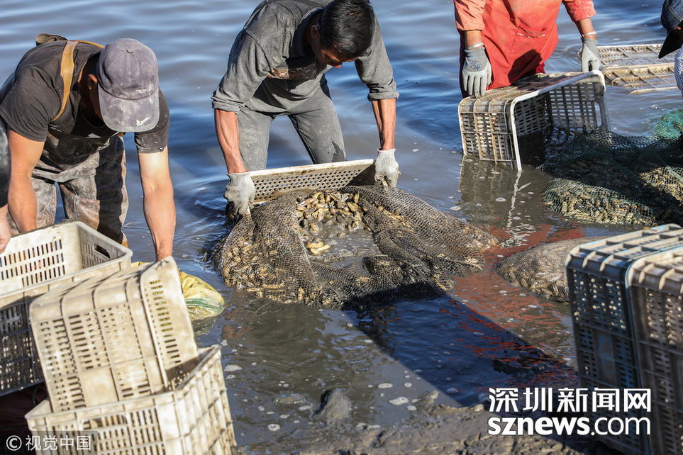 深圳新聞網(wǎng)訊 2018年9月8日,遼寧丹東,早上5點(diǎn),挖蟶人紛紛下到各個(gè)池子,要在海水海泥里艱辛勞作10小時(shí),直至下午3點(diǎn)集體上岸,等待買家的運(yùn)輸車隊(duì)運(yùn)走他們的勞動(dòng)成果。9月初,遼寧沿海養(yǎng)殖區(qū)進(jìn)入養(yǎng)殖海鮮的收獲季。在東港,常常出現(xiàn)數(shù)百人乃至上千人集結(jié)在池子里挖蟶子(這里特指縊蟶,即東港當(dāng)?shù)厝怂f的小人仙。下同)的壯觀景象。在養(yǎng)殖海鮮的收獲季,成群的海鷗趁機(jī)“助陣“,人與大自然和諧共處的畫面令人嘆為觀止。