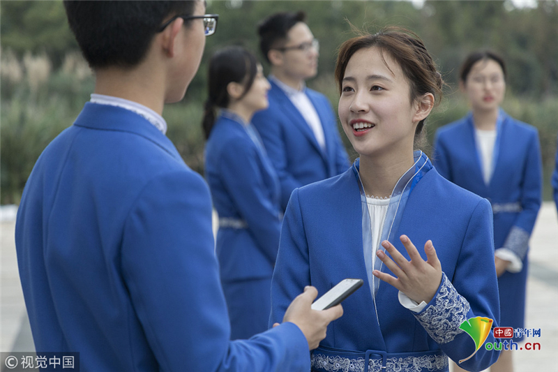 2018年11月1日,浙江省桐鄉(xiāng)市,第五屆世界互聯(lián)網(wǎng)大會(huì)志愿者“小梧桐”出征。圖片作者:王振宇/視覺中國