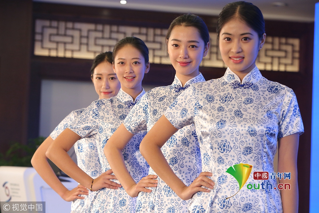2014年11月17日,世界互聯(lián)網(wǎng)大會(huì)直播演練在浙江烏鎮(zhèn)舉行。來(lái)自浙江傳媒學(xué)院的大學(xué)生們,身著一襲青花瓷紋旗袍亮相,顯得分外嫵媚,引人注目。