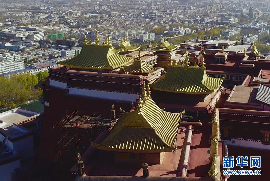 修繕后的布達(dá)拉宮金頂群(11月7日無人機(jī)拍攝)。