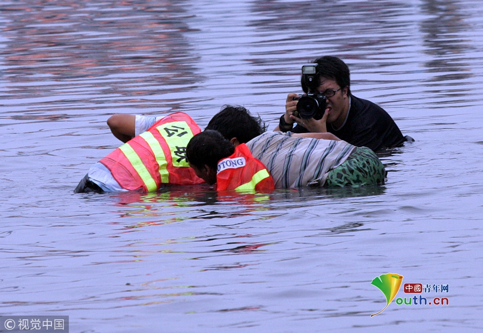 2007年8月6日,北京北三環(huán)安華橋雨后出現(xiàn)積水,這段北京最繁忙的道路之一的路段一度交通中斷,排險(xiǎn)人員緊急趕到現(xiàn)場做出排水等應(yīng)急舉措。圖片作者:王玨茜/視覺中國