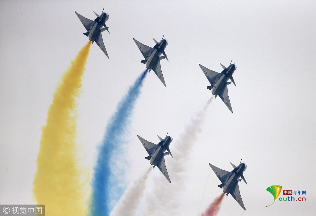 2018年11月8日,廣東珠海,第十二屆中國(guó)國(guó)際航展第三天??哲姟鞍艘弧憋w行表演隊(duì)的隊(duì)員們,發(fā)揚(yáng)連續(xù)作戰(zhàn)精神,給觀眾們表演了七機(jī)分組開花、四機(jī)編隊(duì)橫滾等高難動(dòng)作,受到觀眾們的稱贊。視覺中國(guó)