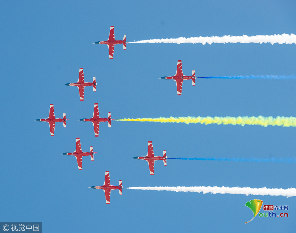 2018年11月7日,廣東珠海,第12屆珠海航展在金灣機場如火如荼進行??哲姾娇沾髮W(xué)“紅鷹”飛行表演隊在第十二屆中國航展進行了飛行表演,展示了飛行員精湛的飛行技能。視覺中國