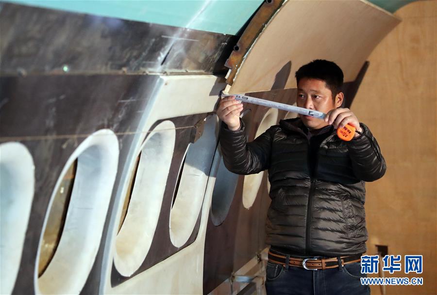遼寧開原農(nóng)民朱躍從小很喜歡飛機,從2017年開始自掏腰包花費200多萬元和團隊成員在老城街道前三臺子村純手工制作了一架仿“空客320”飛機。目前,“飛機”外殼已經(jīng)做好,進入內(nèi)部裝修和外部噴漆階段,等“飛機”建造好以后,他想把“飛機”做成主題餐廳、婚紗攝影和飛行駕駛體驗于一體的項目?!八m然不能飛,整個制作過程也很艱難,但圓了自己的飛機夢”,朱躍說。