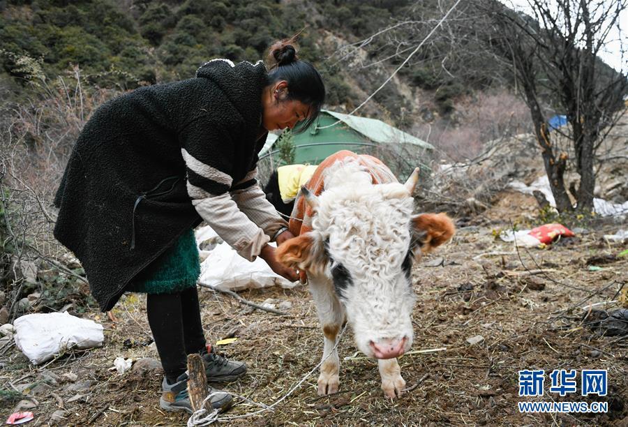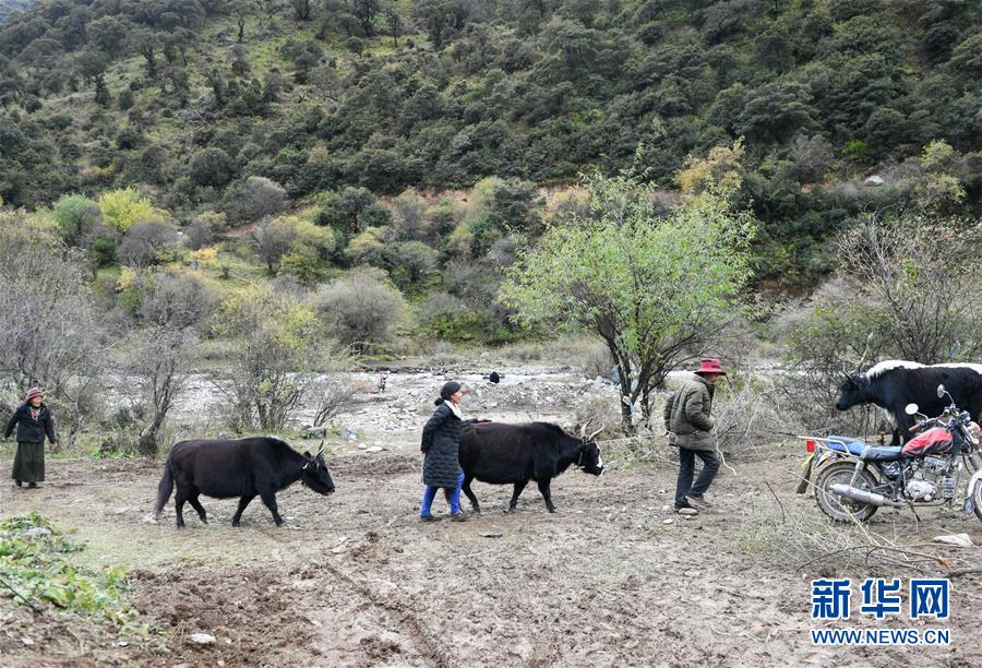 波羅鄉(xiāng)一臨時(shí)過渡安置點(diǎn)內(nèi)的群眾在放牛(10月14日攝)。 新華社記者 劉東君 攝