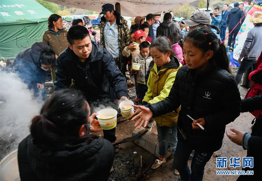 波羅鄉(xiāng)工作人員在臨時(shí)過渡安置點(diǎn)內(nèi)為波羅鄉(xiāng)第一小學(xué)學(xué)生盛晚飯(10月14日攝)。 新華社記者 劉東君 攝
