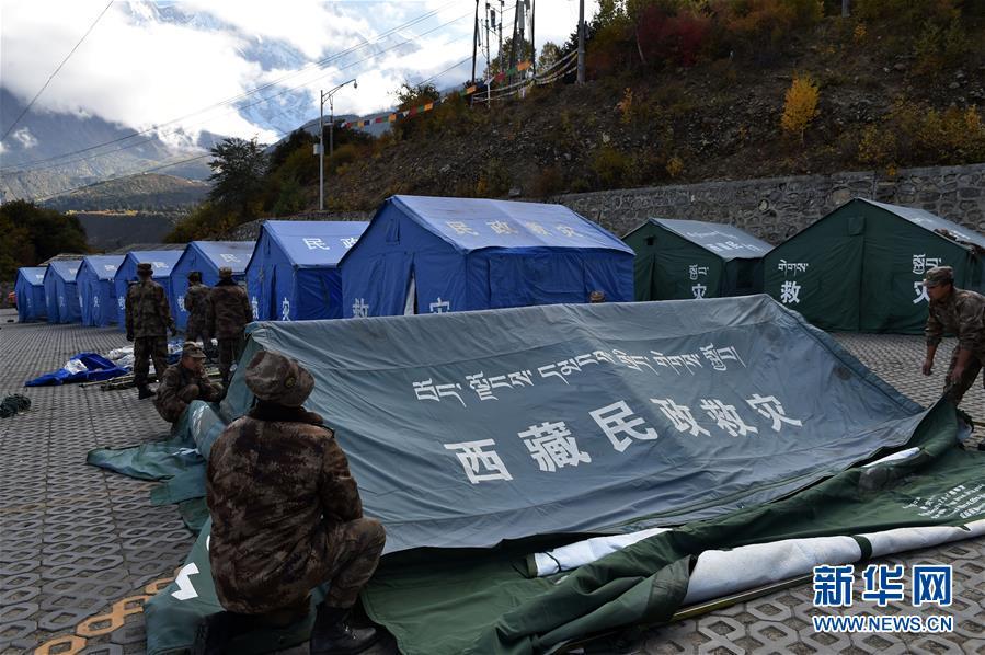 10月19日,救援人員在米林縣派鎮(zhèn)尼定村搭建安置點(diǎn)。 記者從西藏自治區(qū)林芝加拉村雅魯藏布江堰塞湖災(zāi)情應(yīng)急搶險(xiǎn)工作第二場新聞發(fā)布會(huì)上獲悉,19日13時(shí)30分,雅魯藏布江米林縣堰塞體上游水位超過堰塞體,開始自然過流,上游水位正在緩慢下降。目前,各項(xiàng)搶險(xiǎn)救援工作正在有序開展。 新華社記者 覺果 攝