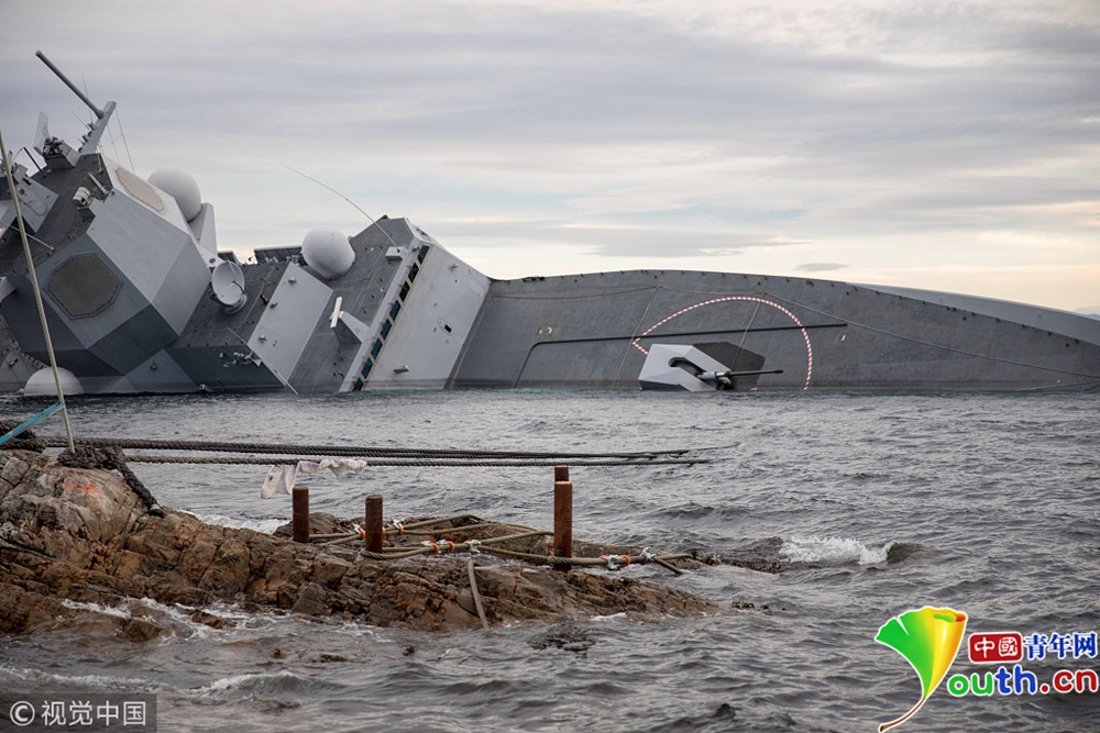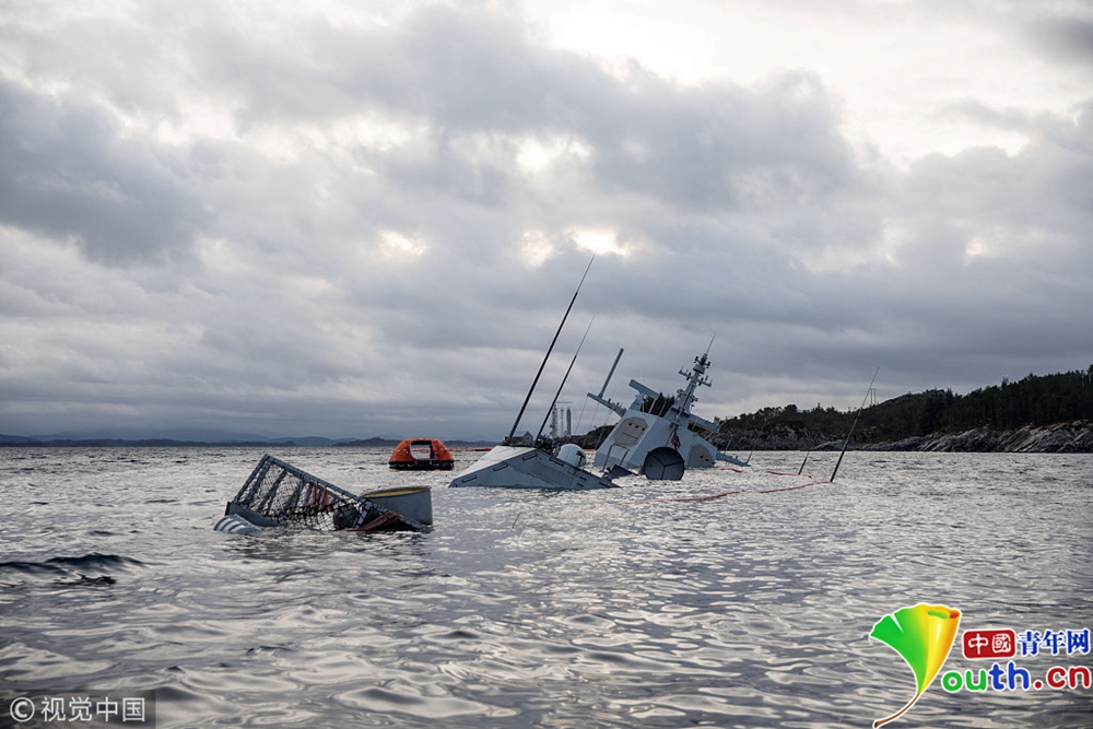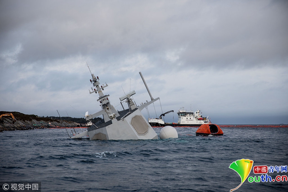 挪威海軍護(hù)衛(wèi)艦“海爾格·英斯塔”號(hào)在挪威西部海域被打撈出水。