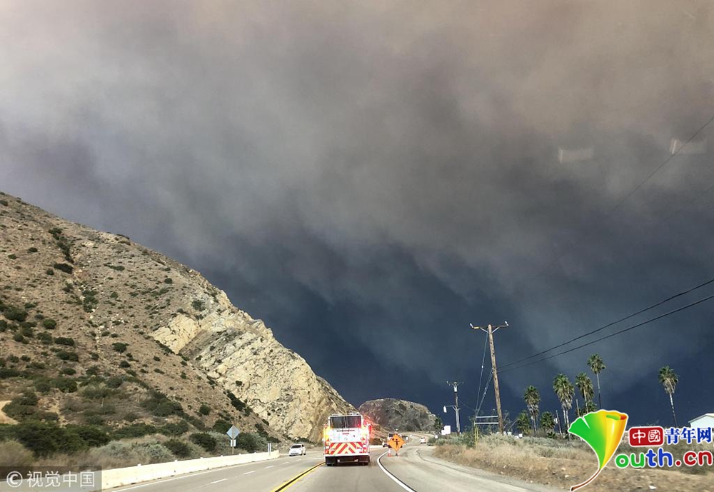 當地時間11月9日下午,美國加利福尼亞州南部文圖拉郡(Ventura County)等地熊熊山火已延燒逾萬英畝,濃煙遮天蔽日。