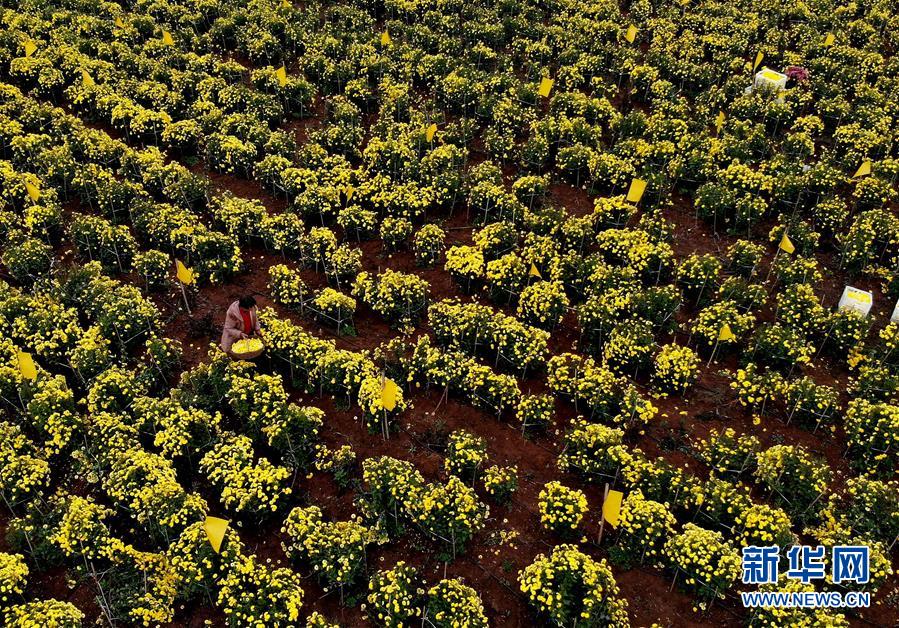 11月14日,在河南省內(nèi)鄉(xiāng)縣乍曲鎮(zhèn)水溝村千畝酈邑貢菊基地,農(nóng)戶在采摘菊花(無人機(jī)拍攝)。 近年來,河南省內(nèi)鄉(xiāng)縣依托資源優(yōu)勢,把發(fā)展特色農(nóng)業(yè)作為精準(zhǔn)扶貧的重要舉措,采取“公司+合作社+農(nóng)戶”的方式,招引農(nóng)業(yè)龍頭企業(yè)發(fā)展菊花種植產(chǎn)業(yè),把菊花加工成茶飲、藥材等高附加值產(chǎn)品,累計帶動150余戶貧困戶就業(yè)增收。 新華社記者 李安 攝