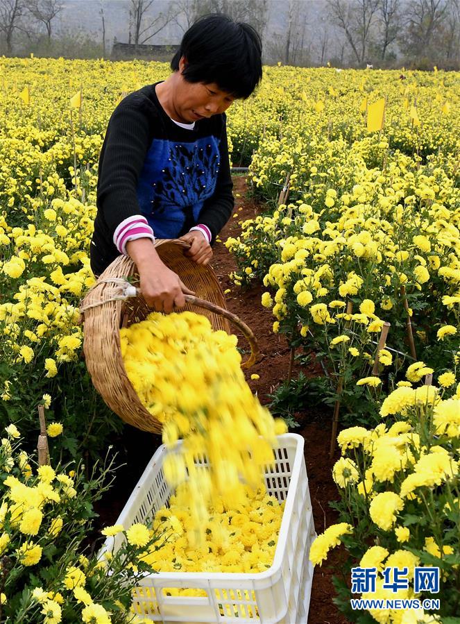 11月14日,在河南省內(nèi)鄉(xiāng)縣乍曲鎮(zhèn)水溝村千畝酈邑貢菊基地,農(nóng)戶將采摘的菊花裝筐。 近年來,河南省內(nèi)鄉(xiāng)縣依托資源優(yōu)勢,把發(fā)展特色農(nóng)業(yè)作為精準(zhǔn)扶貧的重要舉措,采取“公司+合作社+農(nóng)戶”的方式,招引農(nóng)業(yè)龍頭企業(yè)發(fā)展菊花種植產(chǎn)業(yè),把菊花加工成茶飲、藥材等高附加值產(chǎn)品,累計帶動150余戶貧困戶就業(yè)增收。 新華社記者 李安 攝