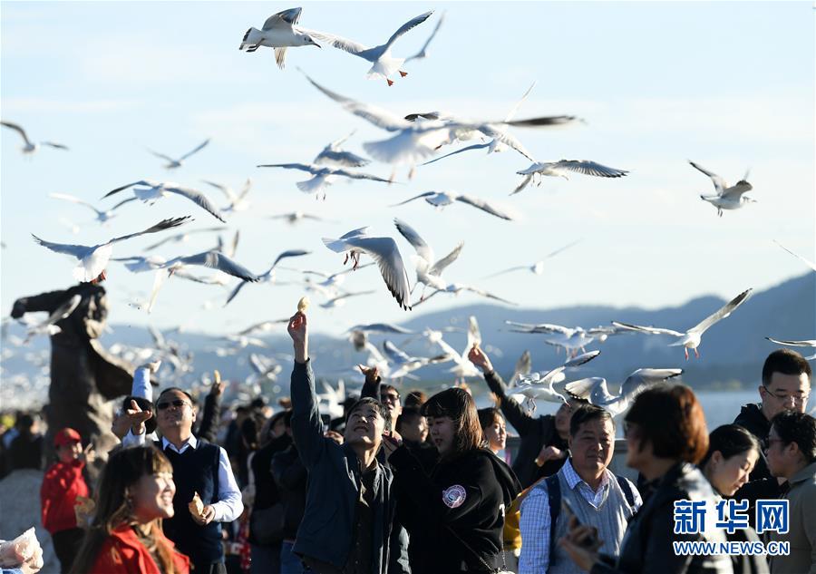 11月14日,人們在昆明滇池邊與紅嘴鷗嬉戲。