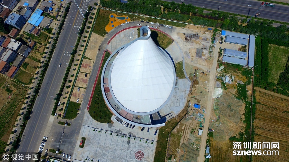 2018年6月13日,航拍河南淮陽(yáng)一座即將竣工落成的體育場(chǎng)館建筑,市民稱酷似一個(gè)石磨盤(pán)。