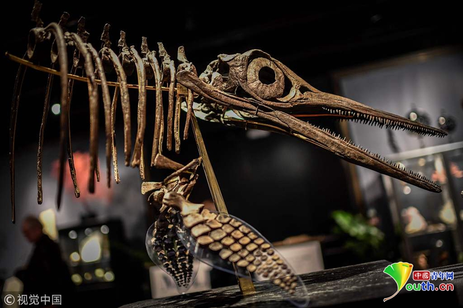 當(dāng)?shù)貢r間2018年11月19日,法國巴黎,在展出中的1.8億年前侏羅紀(jì)時期的恐龍骨架,將于11月20日在Drouot拍賣行拍賣。圖片來源:視覺中國
