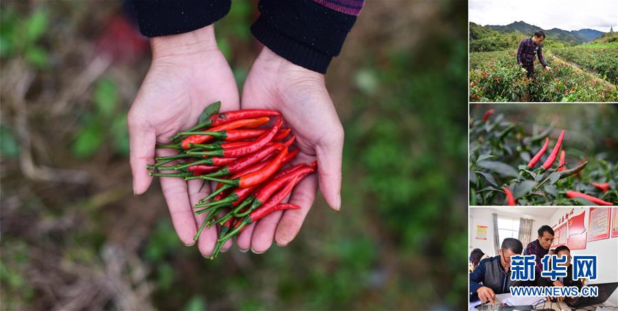 拼版照片:左圖為在大浪鎮(zhèn)大德村,龍德手捧剛剛收獲的辣椒;右上圖為龍德在摘辣椒;右中圖為合作社種植的辣椒;右下圖為龍德(中)在辦公室里工作(照片均攝于11月18日)。龍德是大德村的致富帶頭人,目前合作社種植有400多畝辣椒,帶動106戶貧困戶參與。 廣西融水苗族自治縣是國家扶貧工作重點縣,全縣“九山半水半分田”,生活生產(chǎn)環(huán)境較為惡劣,脫貧攻堅任務(wù)艱巨,目前還有7.68萬貧困人口。面對經(jīng)濟發(fā)展落后、貧困面廣且程度深的現(xiàn)狀,當(dāng)?shù)匕衙撠毠耘c創(chuàng)新產(chǎn)業(yè)扶持相結(jié)合,依托生態(tài)資源優(yōu)勢,實施“特色產(chǎn)業(yè)富民行動”,通過發(fā)展特色民族旅游、林下經(jīng)濟和特色養(yǎng)殖業(yè)等扶貧產(chǎn)業(yè),帶動貧困群眾依靠勤勞的雙手,拔窮根摘窮帽,實現(xiàn)脫貧致富。據(jù)了解,目前全縣貧困戶參與特色產(chǎn)業(yè)發(fā)展的有2.9萬戶,扶貧產(chǎn)業(yè)覆蓋率達95%。 新華社記者 黃孝邦 攝